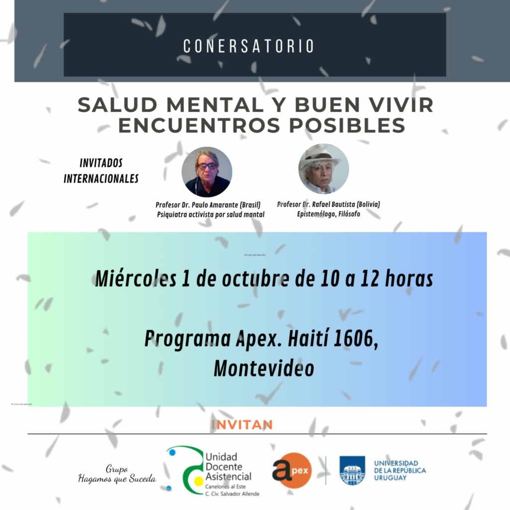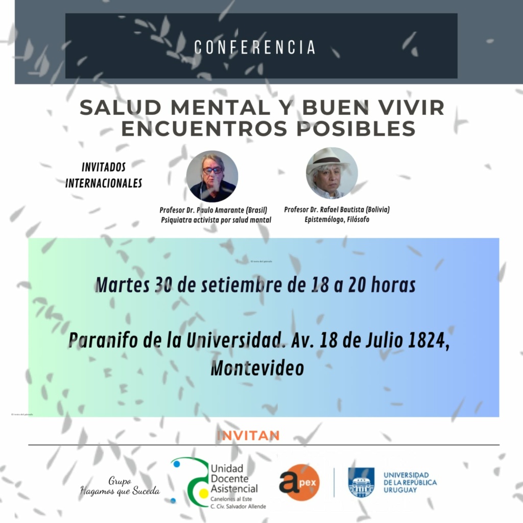 El martes 30 de setiembre en el Paraninfo de la Universidad de la República (Avenida 18 de Julio 1824, Montevideo) se llevará a cabo una conferencia sobre salud mental a cargo de ambos invitados internacionales.